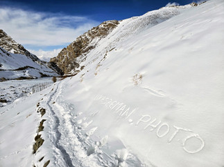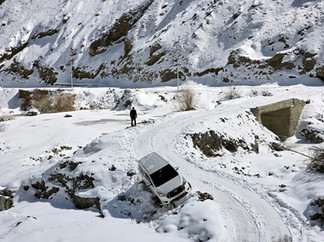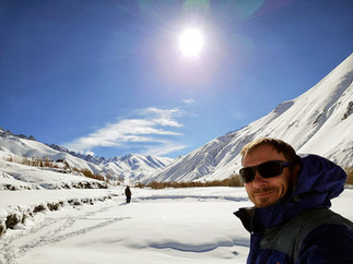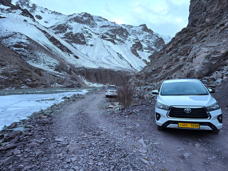 Když si místní zvykli na přival sněhu, nasadili řetězy na auta a alespoň trochu protáhli hlavní ulice, mohli jsme konečně vyrazit do údolí Rumbak. Necelých třicet kilometrů bylo s řetězy sjízdných, dva kilometry před cílem už ale cesta začala být hodně zasněžená a stoupání do konce už náš řidič nezvládl a zůstali jsme zapadlí. Museli jsme tak auto nechat v údolí a vydat se pěšky do kopců. Náš průvodce, plný optimismu, oznámil, že cestu „hravě zvládneme“, zatímco jsme si všichni odhadovali, jak dlouho vydržíme na téhle šílené horské výpravě.